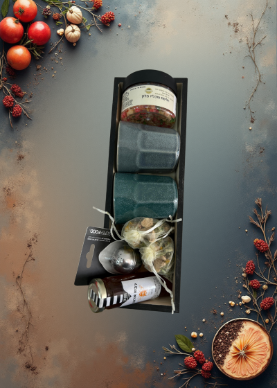 המארז כולל: שני ספלי קרמיקה מעוצבים, תערובת תה טבעית עם פירות מיובשים,