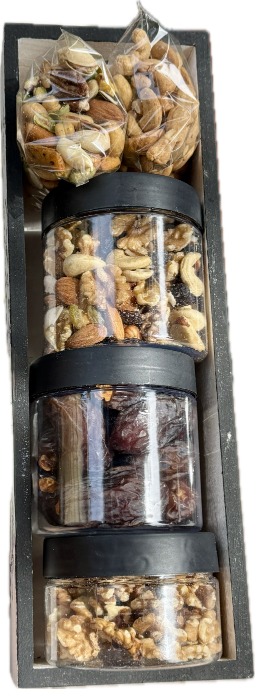 המארז כלל מגש עץ יוקרתי, שקית מיקס פיצוחים, שקית קשיו קלוי