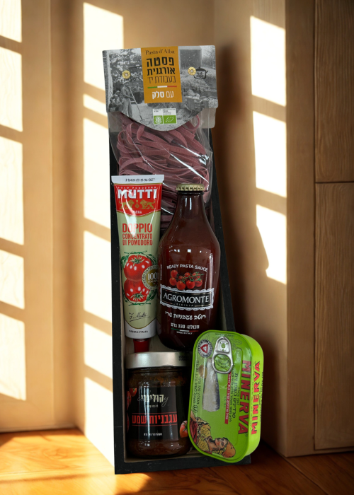 כולל: פסטה בעבודת יד Pasta d’Alba עם סלק, רוטב עגבניות איטלקי Agromonte, רסק עגבניות Mutti, עגבניות מיובשות בשמן, ושימורי דג איכותיים Minerva.